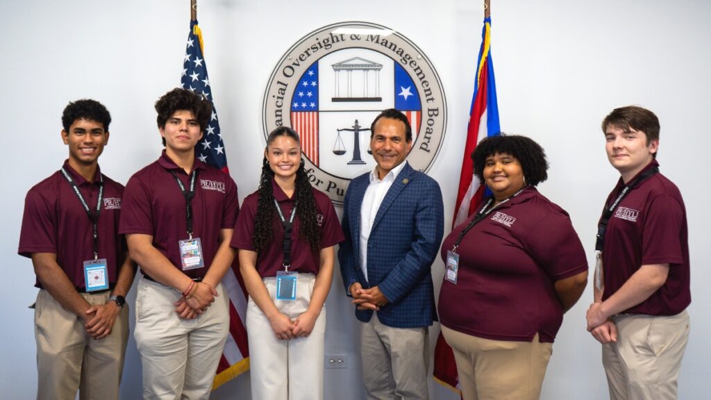 Varios estudiantes del Instituto de Liderazgo Juvenil Puertorriqueño/Hispano Angelo Del Toro visitaron la Junta de Supervisión como parte de su experiencia anual de liderazgo y participación cívica en Puerto Rico. Durante la visita, el grupo se reunió con el director ejecutivo Robert F. Mujica, Jr. y el subdirector ejecutivo Arnaldo Cruz para aprender sobre la transformación fiscal de Puerto Rico y PROMESA.